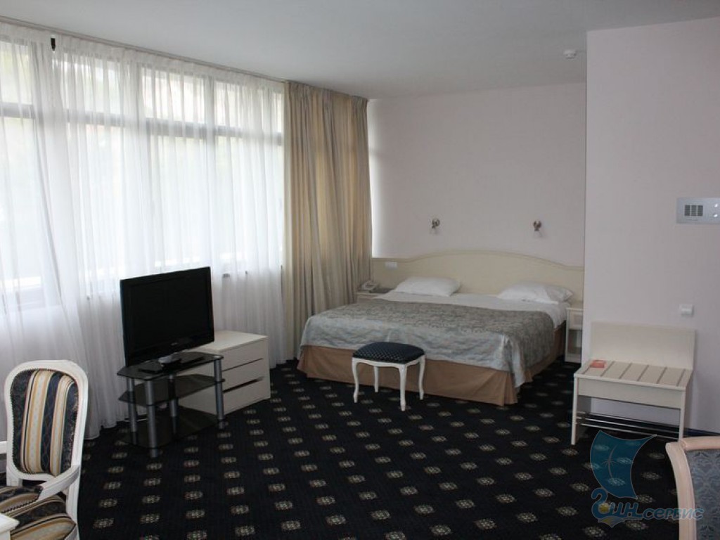 Двухместный однокомнатный номер категории Superior без балкона – это комфортабельный номер с площадью 20 кв.м., всего 10 номеров данной категории. Номер укомплектован современным санузлом, плоским телевизором со спутниковыми каналами, кондиционером, холодильником, телефоном, раздельными кроватями, журнальным и рабочим столом. Из номера вид на парк Чаир.
