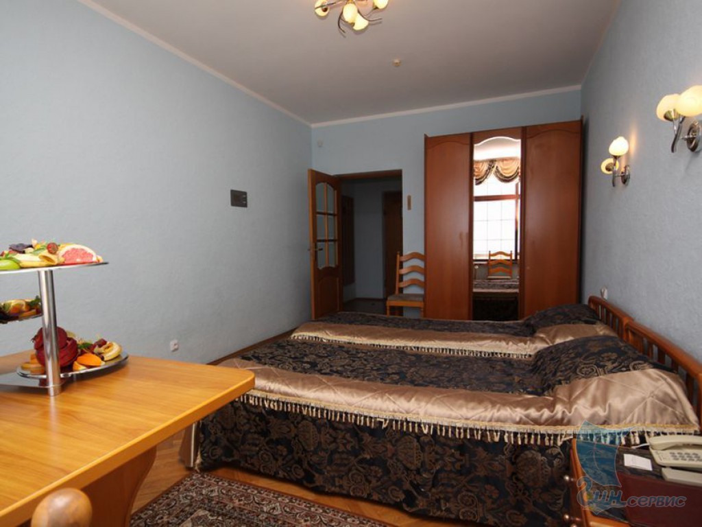 Трехкомнатный номер категории Suite VIP – это просторный и комфортабельный номер с большой площадью 72 кв.м., всего 1 номер подобной категории. Номер укомплектован двумя современными санузлами, плоскими телевизорами со спутниковыми каналами, мни-баром, кондиционером, холодильником, телефоном, двумя спальнями с мебелью, диваном с креслами, обеденным столом, журнальным и рабочим столом, сейфом, небольшой кухней (электроплита, электрический чайник, набор посуды), балконом с мебелью. Из номера вид на парк Чаир и море.