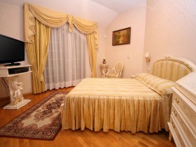 Спальня – просторная комната в которой имеется двуспальная кровать, прикроватные тумбочками со светильниками, зеркала, шкаф, телевизор, телефон, выход на балкон с летней мебелью.