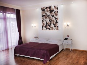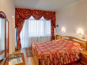 Во всех номерах данной категории: мягкая мебель, большая двуспальная кровать, две прикроватные тумбочки, платяной шкаф.