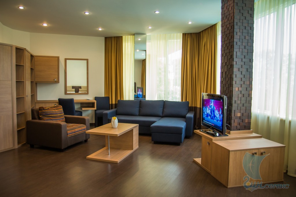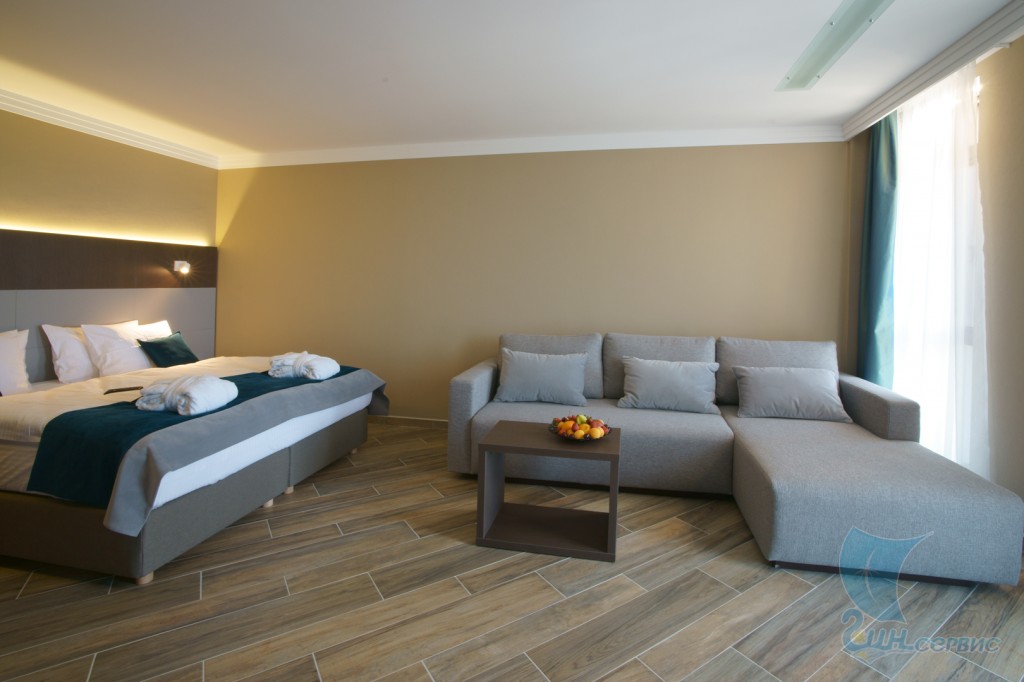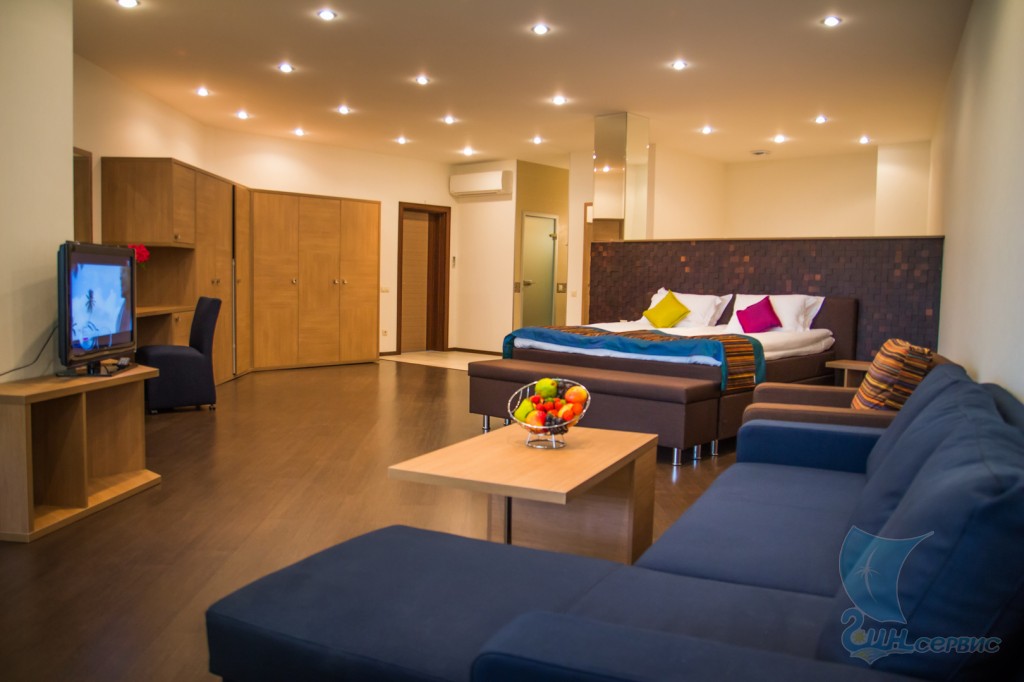 2-местный полулюкс улучшенный Номер с удобствами (санузел,душ,гигиенические принадлежности,фен) В номере: набор мебели, одна двуспальная или две раздельные кровати,телевизор,холодильни.Номер типа «студио» с зоной для отдыха и зоной с ванной-джакузи Вид - дворик с открытым бассейном, солнечная сторона. Площадь: 57м2