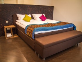 Номер состоит из трех жилых комнат: две спальни "под ключ" в виде отдельных номеров; общая гостиная с зоной для отдыха, полностью оборудованная кухня с обеденной зоной; имеется также гостевой санузел, общая гардеробная комната. Покрытие пола - ламинат, декоративная плитка (гостиная). Общая площадь номера составляет 174 м2. Вид - двор с открытым бассейном, солнечная сторона. Балкон - терраса с дополнительным отдельным выходом во двор отеля. Оснащение номера телевизор кондиционер сейф гладильная доска Оснащение ванной душ халаты тапочки мини-парфюмерия