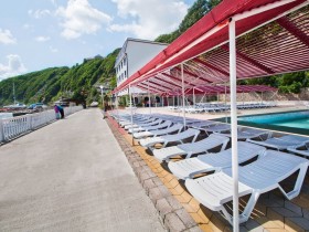 галечный, расположен в 30 м от корпусов, оборудованный теневыми навесами и лежаками. Платные услуги – бар, душ, туалет, яхты, катера, гидроциклы, пляжный и спортивный инвентарь.