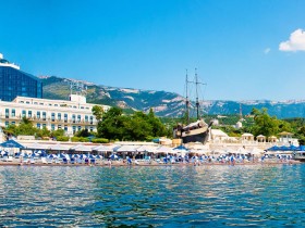 В 50-ти метрах от корпуса отеля Ореанда находится закрытый мелко-галечный пляж отеля, пляж полностью оборудован всем необходимым, теневые навесы, теневые зонты, шезлонги, дорожки, раздевалки, душ и пункт спасателя.